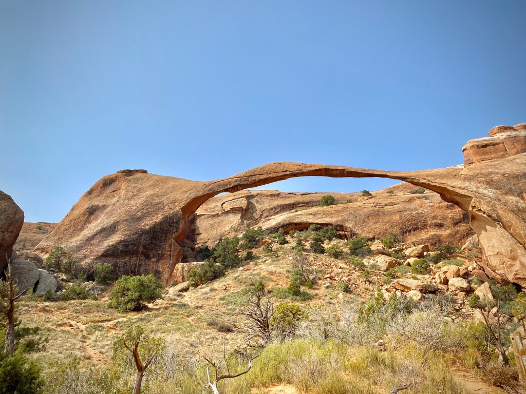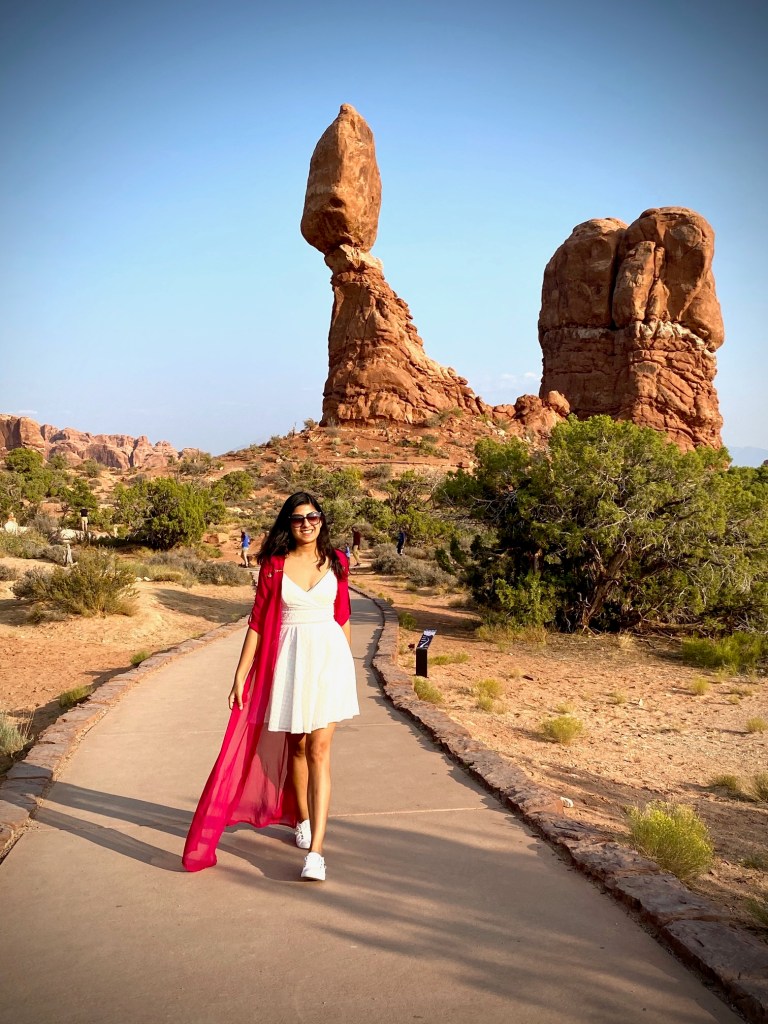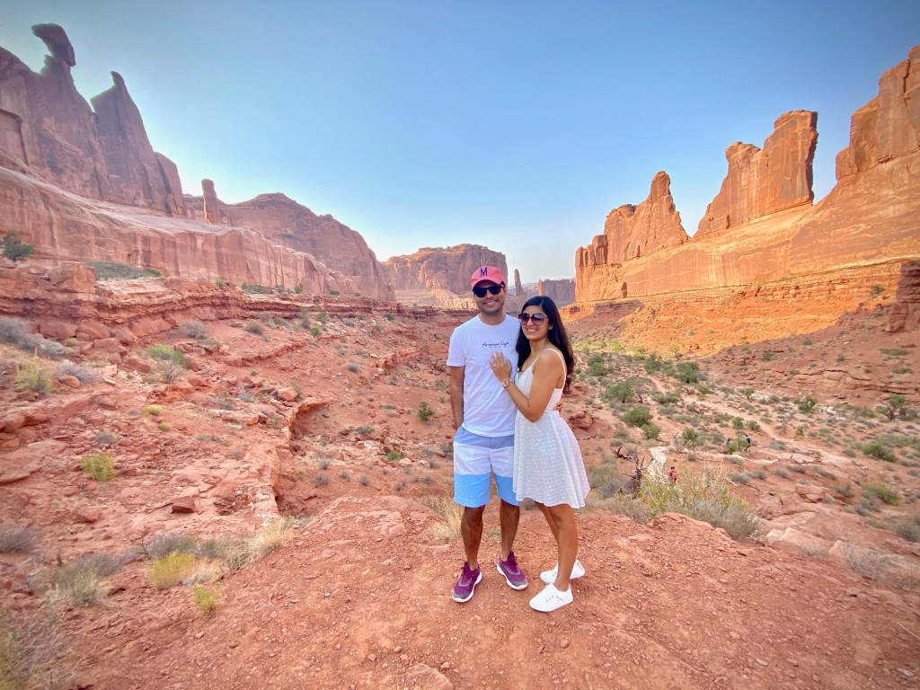 The most popular spot of this park is the Delicate Arch. It is a 3-mile round trip difficult hike with an elevation gain of 480 ft with no shade at all & exposed to heights. We wanted to avoid the crowds and also the harsh sun, so we decided to hike here at the sunrise. It was extremely beautiful to be up there early morning however it still gets crowded so you might want to plan it well. Daytime is extremely hot, and the sun is very strong so highly recommend carrying lot of water. After this hike, we headed to the landscape Arch which is a moderately easy 1.6-mile round trip hike. This hike is a part of the Devil’s Garden which is 7.2-mile trail having some difficult hikes – for those who want to explore the fins to discover hidden arches.