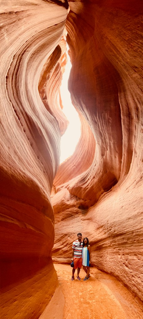 The most exciting part of our day was to begin. We met our guide Jeff at the visitor centre to start our tour. Jeff had a 4×4 high clearance vehicle to take us to the most enchanting spot of Kanab- The Peek-A-Boo slot canyon. Many photographers call it “Antelope Canyon without the crowds”! This is a slot canyon & was formed by eons of swift water rushing through sandstone rock, carrying along with it rocks, trees and whatever else happens to be in the path of the swift current. Looking around the canyon walls, and you can tell just how high the water has RECENTLY been. There are 2 sections to the canyon, so make sure you hike to the end.