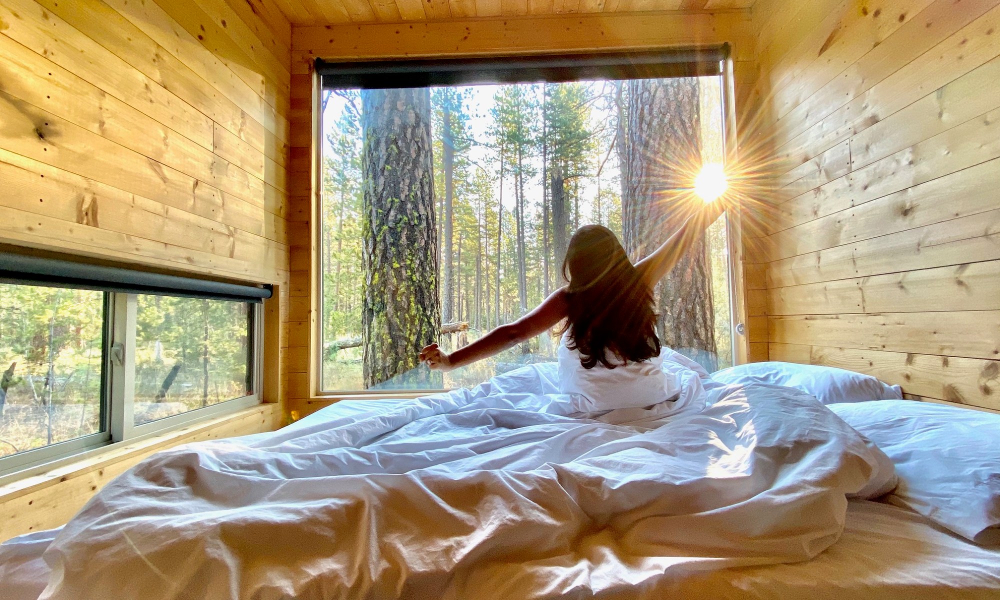 Each cabin features a comfortable queen bed outfitted with fresh white linens, pillows, and cozy throw blanket. The 4-person cabins have two queen beds that are lofted (so you can fight over the top bunk). All beds are always in view of a window, so you can wake up in the trees. If you don’t want to get up with the sun though, just bring down the blinds and sleep in.